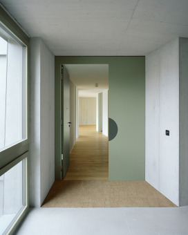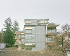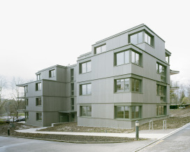 Eine Haut aus sich überlappenden Faserzementplatten spielt auf die Haut eines Schuppentiers an und gibt dem Gebäude einen wesenhaften Ausdruck. Im Schnitt folgt der Baukörper der Hanglage, insgesamt zwölf Wohnungen mit 2.5 bis 4.5 Zimmern sind auf halb versetzten Geschossplatten organisiert.