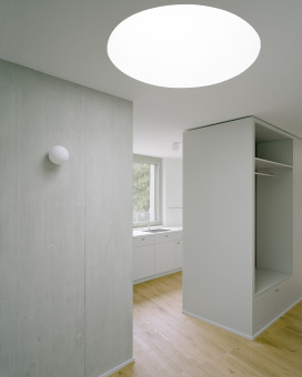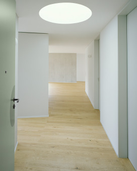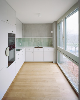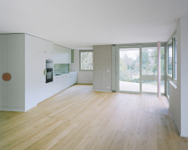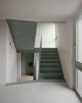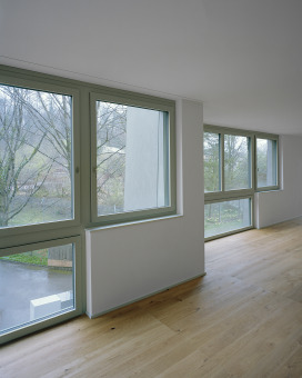 Eine Raumfigur erstreckt sich vom zentral gelegenen Treppenhaus in die Gebäudeecken und mündet da in übereckverglaste Wohn- und Essräume. Diagonal ausgreifende Balkone schaffen Schwellenräume und strukturieren die dahinterliegenden Wohnräume, die Balkone werden zu Gartenzimmer, der Garten wird Teil der Wohnung.